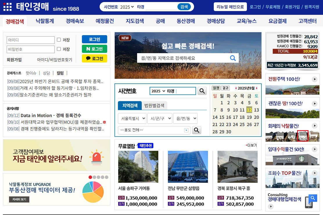 다음 부동산 경매사이트 종료 이후 가장 많이 추천되는 대체 사이트는 부동산태인입니다. 부동산태인은 1988년부터 운영된 법원 부동산 경매 전문 플랫폼으로, 전국 단위 실시간 경매 물건 정보를 제공합니다. 아파트, 상가, 오피스텔, 토지, 공장 등 다양한 부동산 종류를 검색할 수 있으며 온비드 공매 정보까지 함께 조회할 수 있습니다.